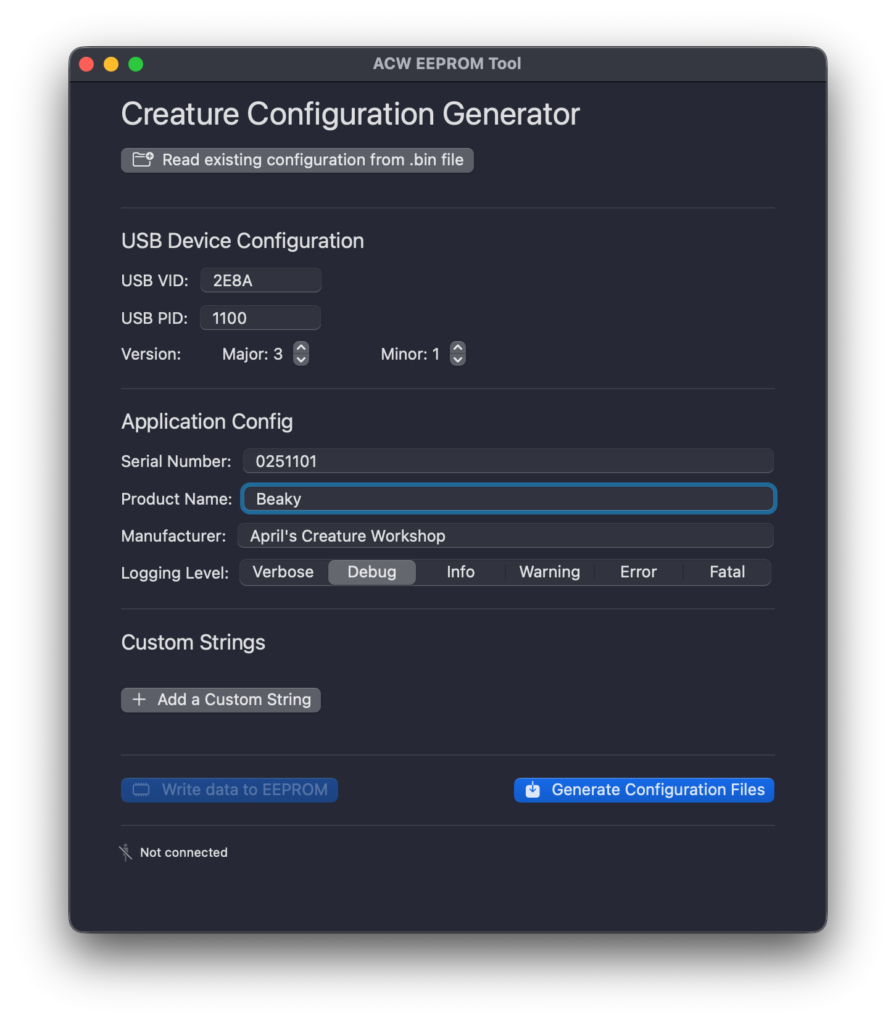 The personality module is configured via my “Creature Configurator.” It’s a simple SwiftUI app that writes out a binary file with the contents of the EEPROM, or can optionally connect to my I2C EEPROM programmer.