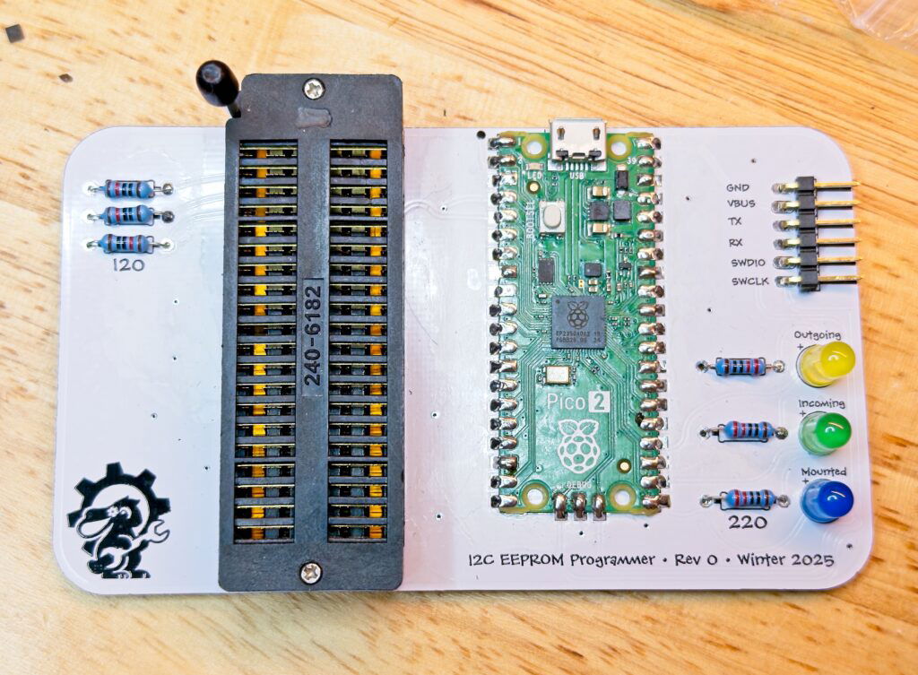 The I2C EEPROM programmer is a really simple device. When I hook it up to my Mac it presents itself as a serial port, and I wrote a little “shell” that runs on the programmer itself. It can be instructed to do things with nothing more than serial terminal. There’s no software needed on the Mac otherwise. (Since it’s only a CDC serial device, it will work on just about any modern computer.)
