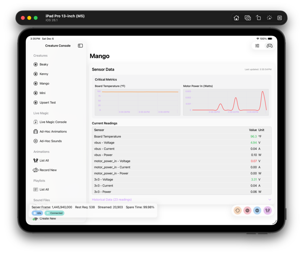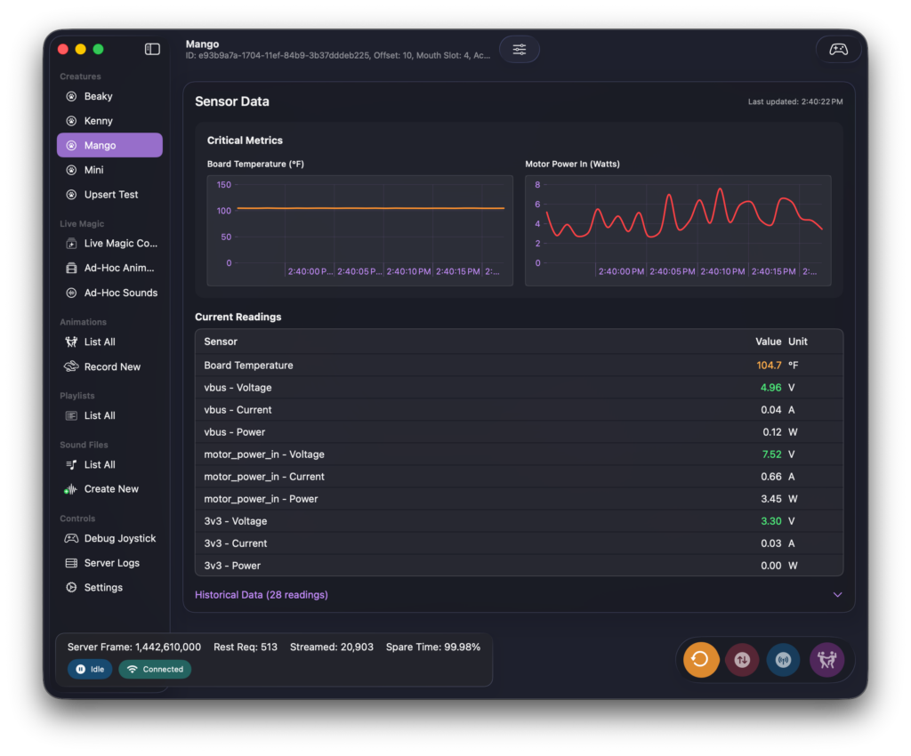 The primary function of the creature detail page is to allow real time monitoring. The data shown on this screen are coming off of the creature’s sensors on its controller.