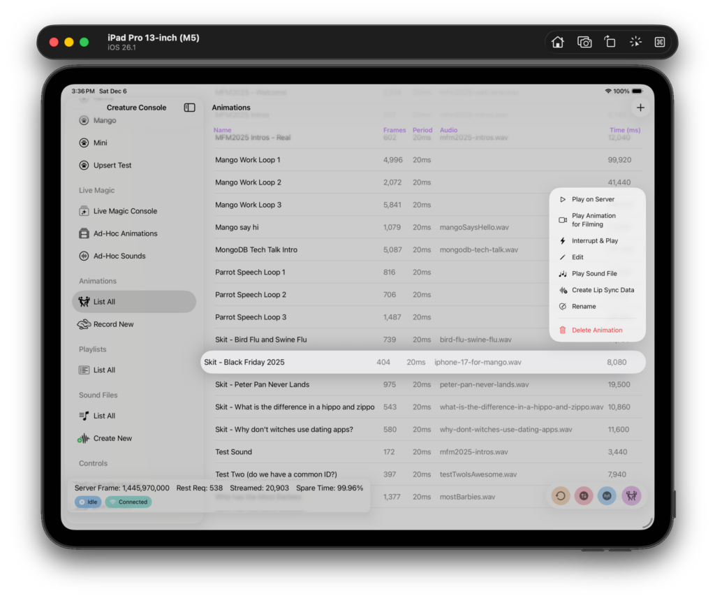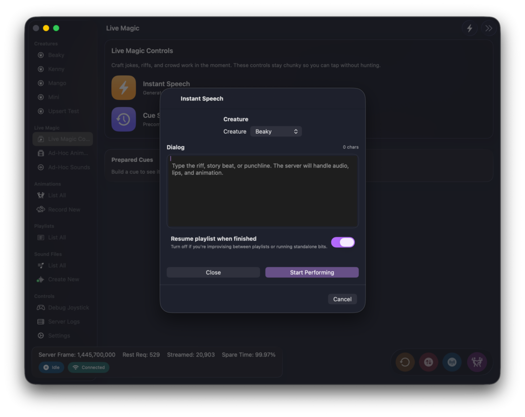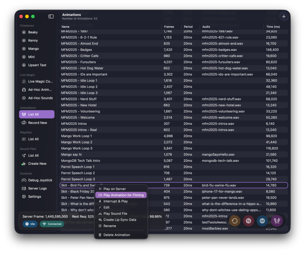One of the things I’m the most proud of is the ability to create “ad-hoc” animations on the fly. These are created in the console by supplying some text that I’d like for the creature to say. Once this is done I am given the choice to make an animation and play it ASAP, or to cue it up. (Timing is the most important thing in comedy so usually I want exact control of when a creature speaks.)