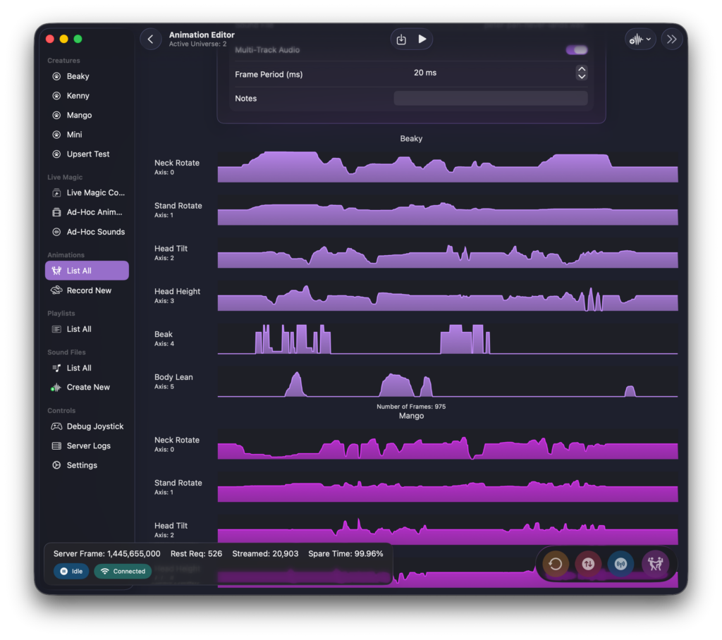 For live use, it has a “streaming mode” where frames from a joystick are transmitted to the Creature Server in real time. I use that for playing around with things and for fun. 😍