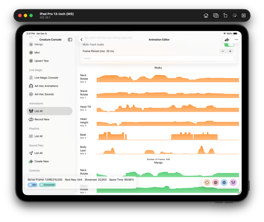 I decided to write my app control app because I couldn’t find one that I liked that worked on macOS. (Getting iOS is also great!) There’s not a lot out there for animatronics on macOS, so I decided to go it alone. I’m glad I did, it’s been awesome having an app I wrote myself and can change as I wish.